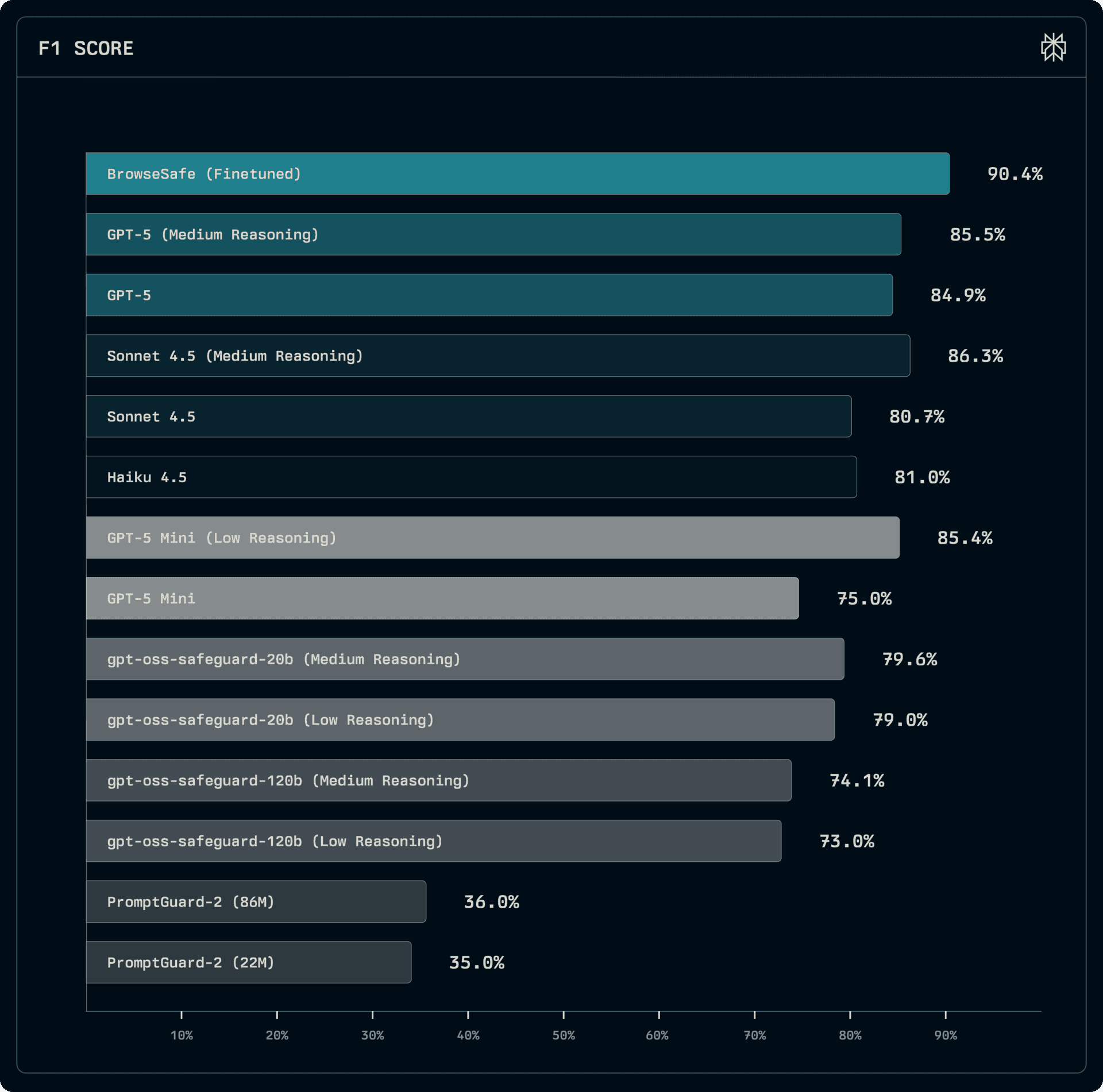 Perplexity’s BrowseSafe fine-tuned model: this wins the day. Note that they’re using their own benchmarking, so while the results are impressive, they did have the ability to stack the deck.